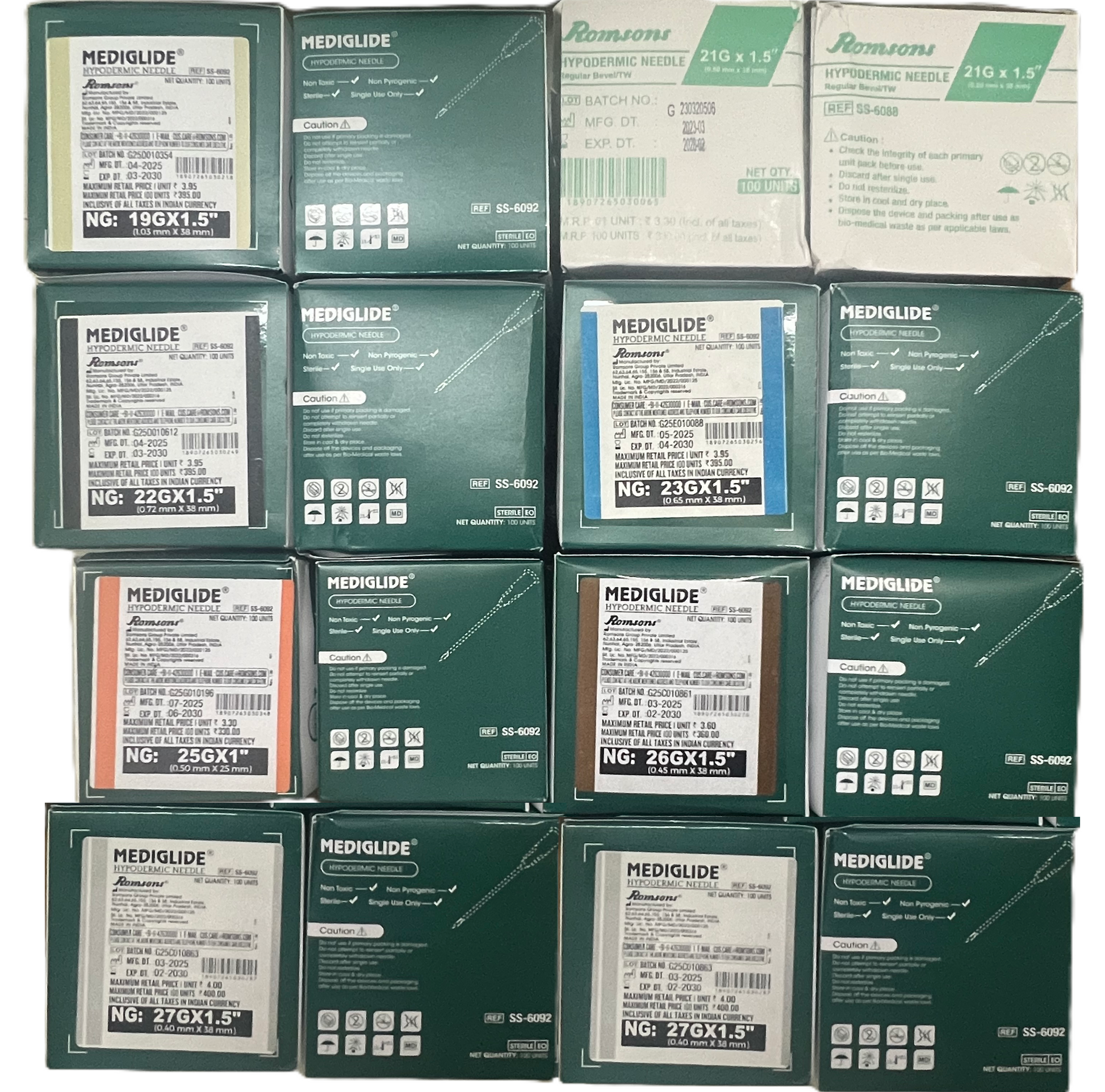 Romsons Mediglide Hypodermic Needles are used for intramuscular (IM), intravenous (IV), subcutaneous (SC), and intradermal injections in clinical and diagnostic settings. They are commonly utilized for medication administration, blood sampling, vaccination drives, and laboratory procedures.